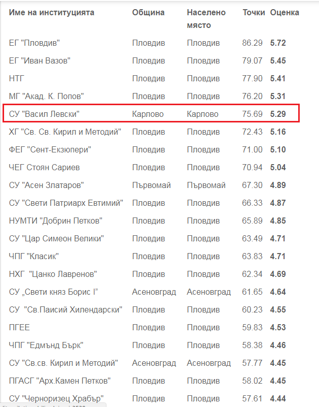 Отново СУ“Васил Левски“ е сред водещите училища в област Пловдив с петото място.