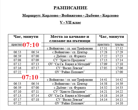 Промяна на часа на тръгване на училищен автобус Маршрут: Карлово – Войнягово – Дъбене – Карлово от 04.11.2025 – ЧАС НА ТРЪГВАНЕ 07:10!!!