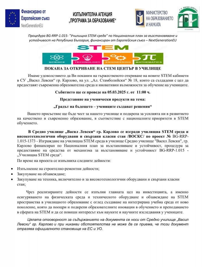 Покана за откриване на СТЕМ център