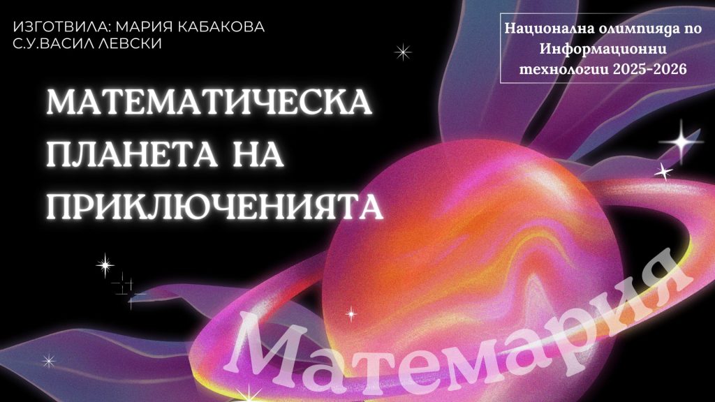 Тази година нашето училище се включва в Националната олимпиада по информационни технологии (НОИТ) 2025 – 2026г. с два интерактивни проекта в направление „Мултимедийни проекти“, разработени от Ивияна Иванова от 6. а клас – проект „Запали искрата“ и Мария Кабакова от 6. б клас – проект „Математическа планета Матемария“ под ръководството на г-жа Мария Николова.